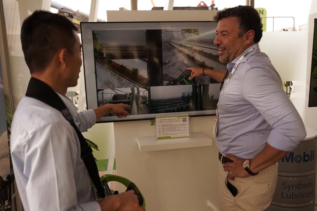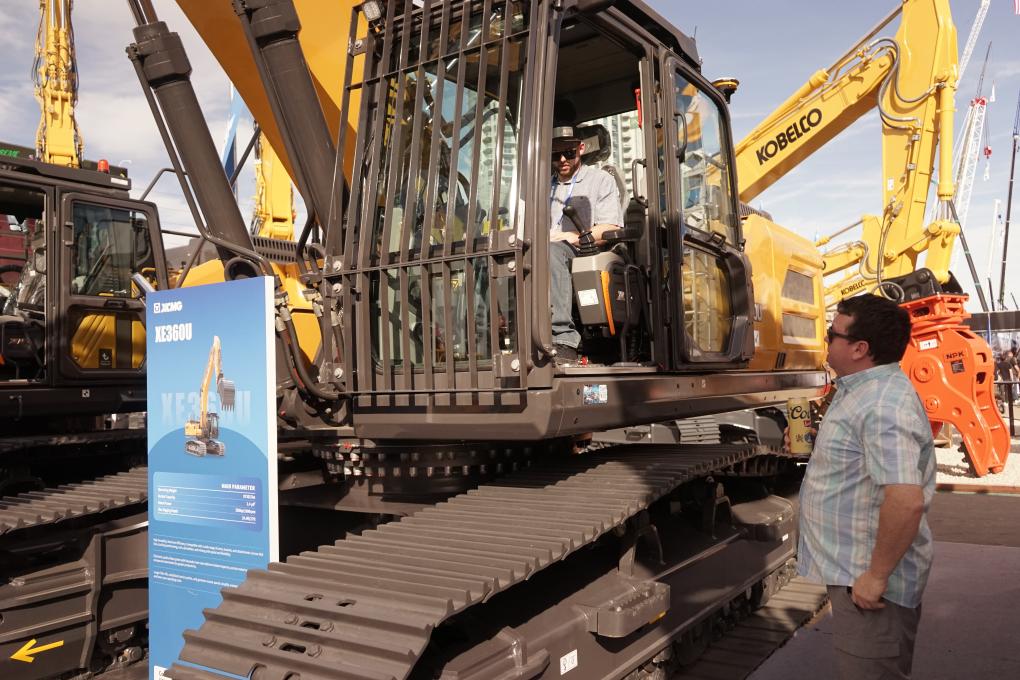 不远处的三一沉工展厅,中联沉科工程师邢立成正在现场操做5G塔式起沉机近程智控系统的遥控器,正在美国拉斯维加斯工程机械展上!